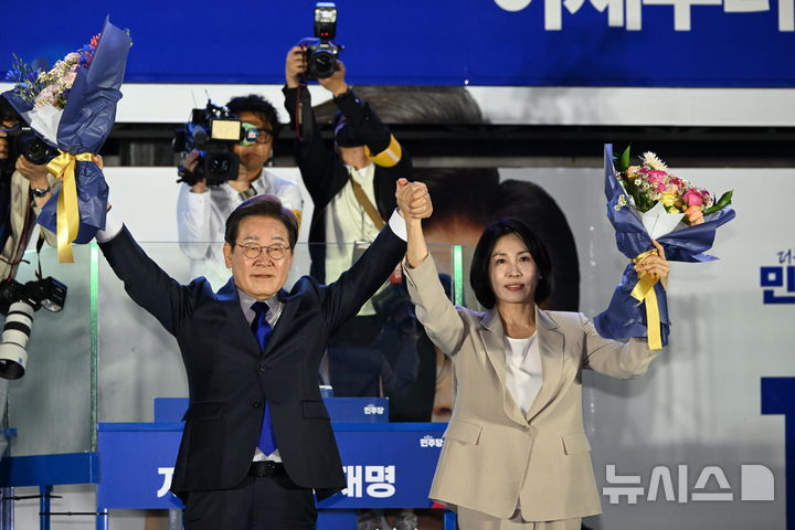 [서울=뉴시스] 조성우 기자 = 이재명 대통령이 4일 오전 서울 여의도 국회 앞에서 열린 국민 개표방송 행사에서 꽃다발을 받은 뒤 시민들을 향해 인사하고 있다. (공동취재) 2025.06.04. [email protected]