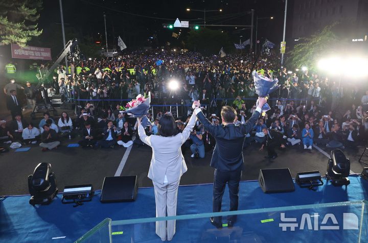 [서울=뉴시스] 조성우 기자 = 이재명 대통령과 김혜경 여사가 4일 오전 서울 여의도 국회 앞에서 열린 국민 개표방송 행사에서 꽃다발을 받은 뒤 시민들을 향해 인사하고 있다. (공동취재) 2025.06.04. [email protected]