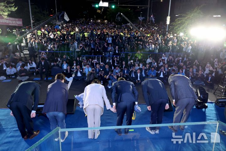 [서울=뉴시스] 조성우 기자 = 이재명 대통령과 김혜경 여사가 4일 오전 서울 여의도 국회 앞에서 열린 국민 개표방송 행사에서 시민들을 향해 인사하고 있다. (공동취재) 2025.06.04. [email protected]
