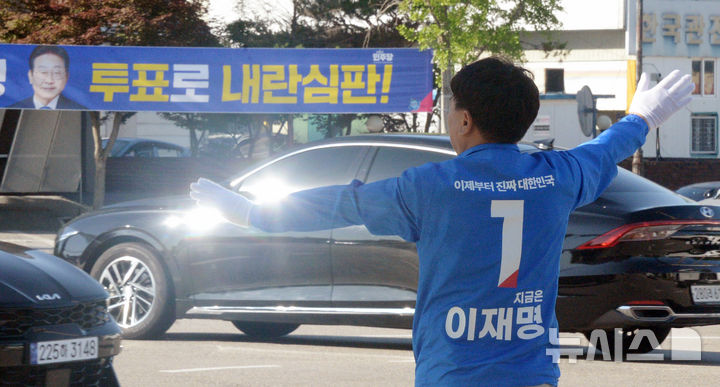 [전주=뉴시스] 김얼 기자 = 제21대 대통령선거 개표가 마무리된 4일 전북 전주시 종합경기장 사거리에서 더불어민주당 전북특별자치도당 관계자들이 이재명 대통령 당선에 대한 감사 인사를 전하고 있다. 2025.06.04. [email protected]