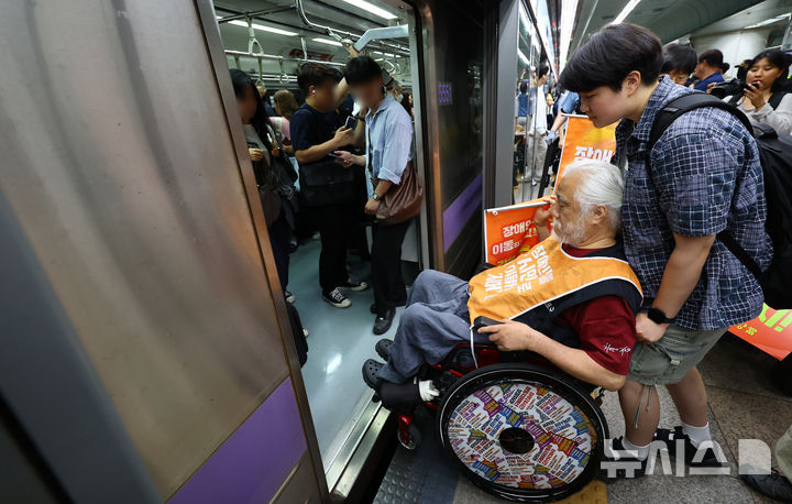 [서울=뉴시스] 박주성 기자 = 박경석 전국장애인찰별철페연대(전장연) 상임대표가 4일 오전 서울 광화문역 승강장에서 대통령 취임을 축하하기 위해 여의도로 향하는 지하철을 타고 있다. 2025.06.04. [email protected]