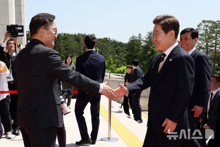 [서울=뉴시스] 조성우 기자 = 이재명 대통령이 취임 선서를 하기 위해 4일 오전 서울 여의도 국회에 들어서며 우원식 국회의장과 악수하고 있다. 2025.06.04. [email protected]