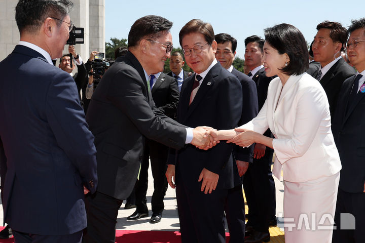[서울=뉴시스] 조성우 기자 = 이재명 대통령이 취임 선서를 하기 위해 4일 오전 서울 여의도 국회에 들어서며 우원식 국회의장의 환영을 받고 있다. 2025.06.04. [email protected]