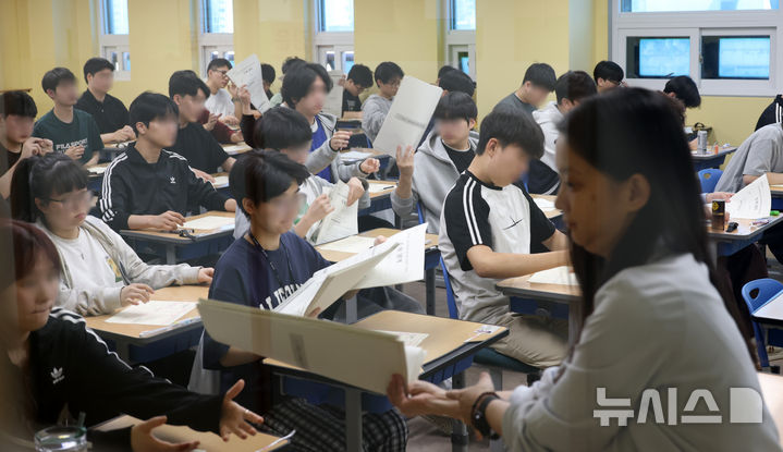 [서울=뉴시스] 이영환 기자 = 재수생들이 2026학년도 대학수학능력시험 6월 평가원 모의고사 시행일인 4일 오전 서울 양천구 종로학원 고사실에서 시험지를 배부받고 있다. (공동취재) 2025.06.04. [email protected]