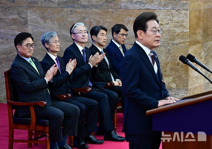 [서울=뉴시스] 국회사진기자단 = 우원식(왼쪽부터) 국회의장과 조희대 대법원장, 김형두 헌법재판소장 권한대행, 이주호 대통령 권한대행 부총리 겸 교육부 장관, 노태악 중앙선거관리위원장 등 5부요인이 4일 오전 서울 여의도 국회에서 열린 취임선서에 참석해 박수를 치고 있다. 2025.06.04. [email protected]