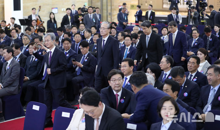 [서울=뉴시스] 국회사진기자단 = 4일 서울 여의도 국회 로텐더홀에서 열린 제21대 대통령 취임 선서식에서 조희대 대법원장, 김형두 헌법재판소장 권한대행, 이주호 국무총리 권한대행, 노태악 중앙선관위원장이 참석하고 있다. 2025.06.04. [email protected]