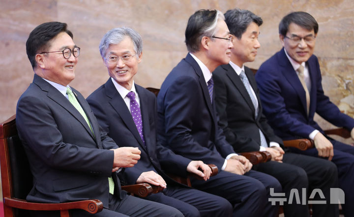 [서울=뉴시스] 국회사진기자단 = 4일 서울 여의도 국회 로텐더홀에서 열린 제21대 대통령 취임 선서식에서 우원식 국회의장, 조희대 대법원장, 김형두 헌법재판소장 권한대행, 이주호 국무총리 권한대행, 노태악 중앙선관위원장이 참석해 서로 대화를 나누고 있다. 2025.06.04. [email protected]