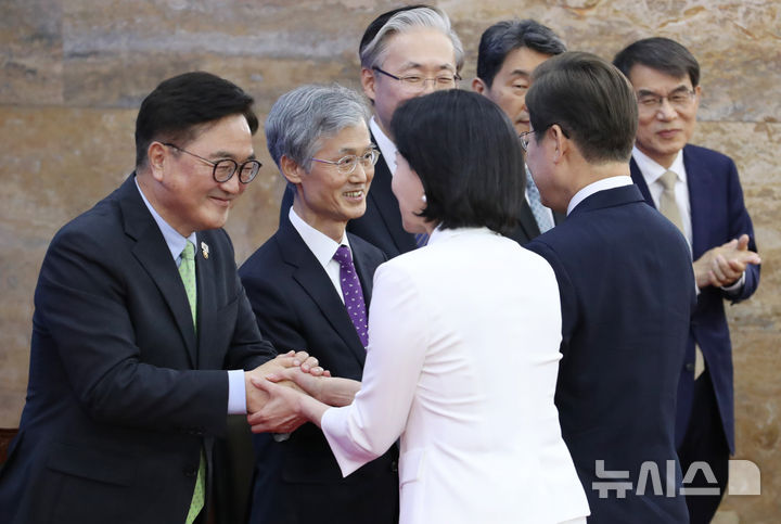 [서울=뉴시스] 국회사진기자단 = 이재명 대통령과 김혜경 여사가 4일 서울 여의도 국회 로텐더홀에서 열린 제21대 대통령 취임 선서식에서 우원식 국회의장, 조희대 대법원장과 인사하고 있다. 2025.06.04. [email protected]