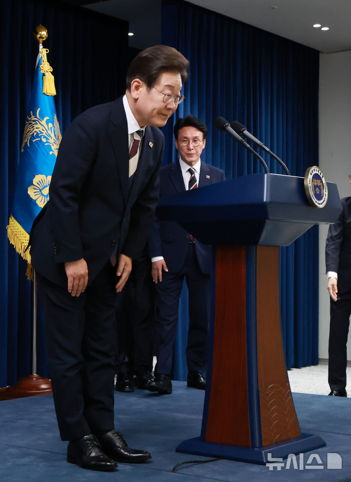 [서울=뉴시스] 고범준 기자 = 이재명 대통령이 4일 서울 용산 대통령실 청사에서 새 정부 첫 인사 발표에 앞서 인사하고 있다. (대통령실통신사진기자단) 2025.06.04. [email protected]