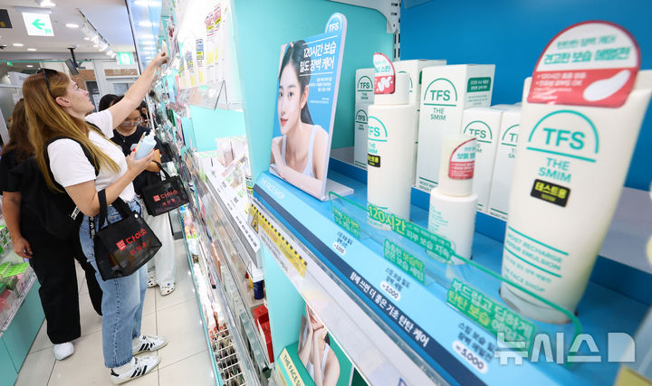[서울=뉴시스] 황준선 기자 = 4일 서울 시내 한 다이소 매장을 찾은 외국인 관광객들이 화장품을 살펴보고 있다.