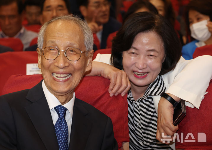 [서울=뉴시스] 고승민 기자 = 4일 서울 여의도 국회 의원회관에서 열린 제21대 대통령 선거 선거대책위원회 해단식에서 윤여준 더불어민주당 상임총괄선대위원장과 추미애 총괄선대위원장이 웃으며 대화하고 있다. 2025.06.04. [email protected]