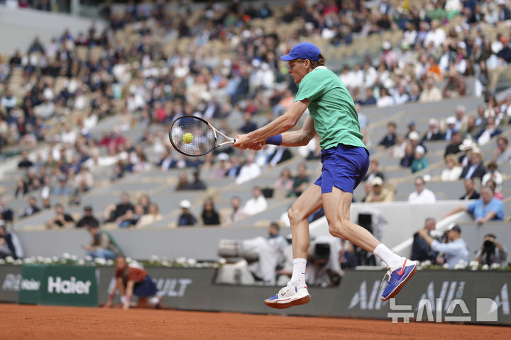 [파리=AP/뉴시스] 얀니크 신네르(1위·이탈리아)가 4일(현지 시간) 프랑스 파리 롤랑가로스에서 열린 프랑스오픈 남자 단식 8강전에서 알렉산드르 부블리크(62위·카자흐스탄)와 경기하고 있다. 이 대회 첫 우승을 노리는 신네르가 3-0(6-1 7-5 6-0)으로 승리하고 4강에 올라 노바크 조코비치(6위·세르비아)와 결승 진출을 다툰다. 2025.06.05.