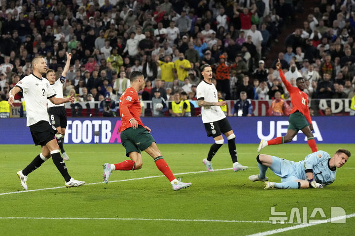 [뮌헨=AP/뉴시스] 포르투갈의 크리스티아누 호날두(가운데)가 4일(현지 시간) 독일 뮌헨 알리안츠 아레나에서 열린 2024-25 유럽축구연맹(UEFA) 네이션스리그 독일과의 준결승 후반 23분 역전 골을 넣고 있다. 40세의 호날두가 A매치 137골을 기록하며 포르투갈의 2-1 승리를 이끌었고 스페인-프랑스 승자와 대망의 우승을 다툰다. 2025.06.05.