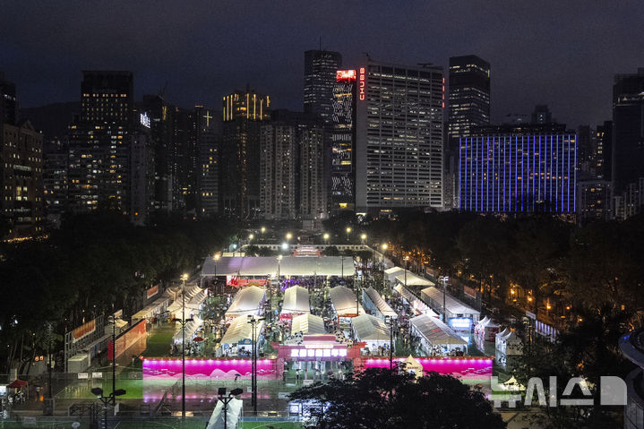 [홍콩=AP/뉴시스] 톈안먼 사태 36주기인 4일(현지 시간) 홍콩 빅토리아 파크에서 친중 단체들이 먹거리 축제를 열고 있다. 이 공원은 매년 톈안먼 사태 추모 집회가 열리는 장소로 친중 단체들은 집회를 막기 위해 4년째 음식 축제를 열고 있다. 2025.06.05.