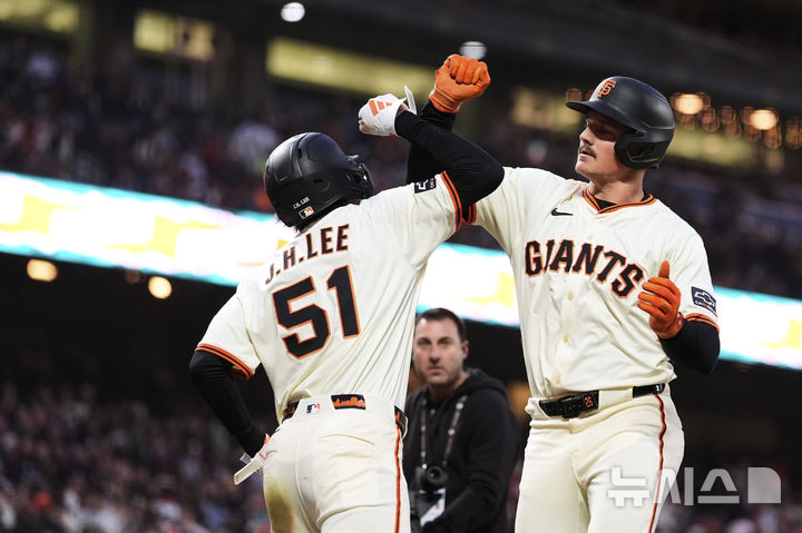 [샌프란시스코=AP/뉴시스] 샌프란시스코 자이언츠의 이정후(왼쪽)가 4일(현지 시간) 미 캘리포니아주 샌프란시스코 오라클 파크에서 열린 2025 메이저리그 샌디에이고 파드리스와의 경기 6회 말 2점 홈런을 친 맷 채프먼을 환영하고 있다. 이정후는 좌전 2루타로 진루한 후 채프먼의 홈런으로 홈을 밟았다. 2025.06.05.