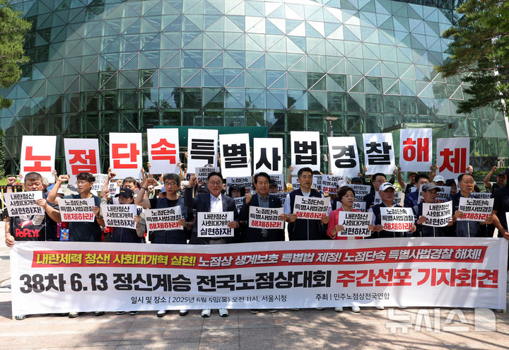 [서울=뉴시스] 홍효식 기자 = 5일 서울시청 앞에서 민주노점상전국연합 회원들이 6.13 정신계승 제38차 전국노점상대회 주간선포 기자회견을 열고 노점상 생계보호 특별법 제정과 노점단속 특별사법경찰 해체를 촉구하고 있다. 2025.06.05. [email protected]