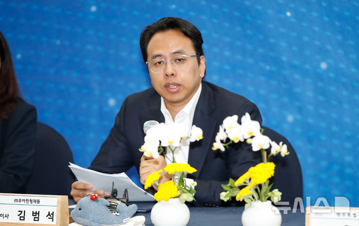 [서귀포=뉴시스] 우장호 기자 = 김범석 우아한형제들 대표이사가 5일 서귀포시 제주국제컨벤션센터(ICC)에서 열린 '용기 있는 주문 - 배달 다회용기 이용 활성화를 위한 업무협약식'에서 인사말을 하고 있다. 2025.06.05. [email protected]