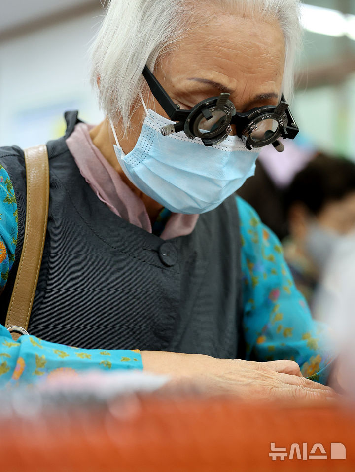 [대구=뉴시스] 이무열 기자 = 5일 대구 중구 서문교회에서 열린 2025 중구 한마음 순회봉사 행사장을 찾은 어르신이 돋보기 지급을 받기 위해 시력검사를 하고 있다. 2025.06.05. [email protected]