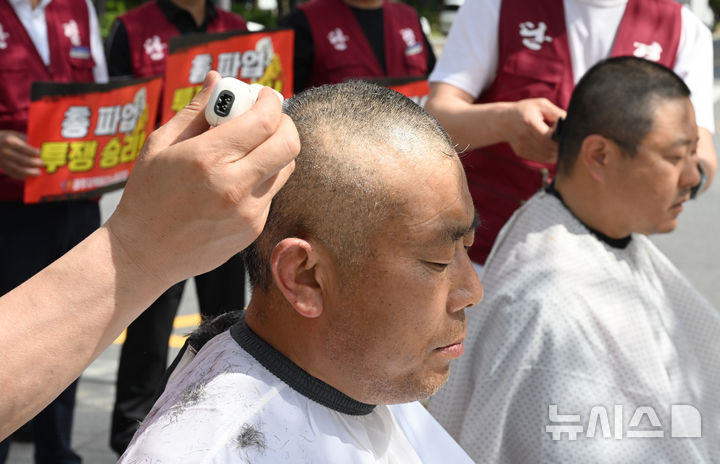 [광주=뉴시스] 김혜인 기자 = 전국자동차노동조합연맹 광주지역버스노동조합이 총파업을 시작한 5일 오후 광주 서구 광주시청 앞에서 '임금인상 승리쟁취' 총파업 투쟁 결의대회를 열고 삭발식을 갖고 있다. 2025.06.05. [email protected]