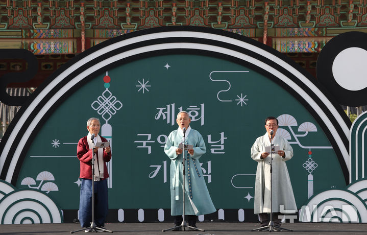 [서울=뉴시스] 김금보 기자 = 유인촌 문화체육관광부 장관이 제1회 국악의날을 맞은 5일 오후 서울 종로구 경복궁 흥례문에서 열린 기념식에서 기념일을 선포하고 있다. 2025.06.05. [email protected]