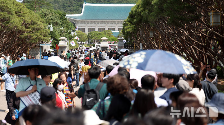 [서울=뉴시스] 추상철 기자 = 현충일인 6일 오전 서울 종로구 청와대에서 관람객들이 길게 줄 서 있다.