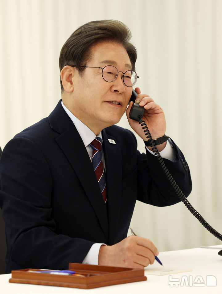 [서울=뉴시스] 고범준 기자 = 이재명 대통령이 6일 서울 한남동 관저에서 도널드 트럼프 미국 대통령과 전화 통화를 하기 위해 수화기를 들고 있다. 2025.06.06. [email protected]