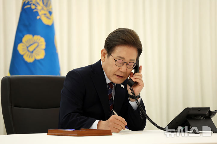 [서울=뉴시스] 고범준 기자 = 이재명 대통령이 6일 서울 한남동 관저에서 도널드 트럼프 미국 대통령과 전화 통화를 하기 위해 수화기를 들고 있다. 2025.06.06. [email protected]