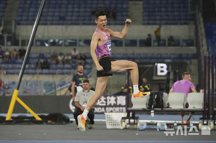 [로마=AP/뉴시스] 우상혁이 6일(현지 시간) 이탈리아 로마의 스타디오 올림피코에서 열린 2025 세계육상연맹 다이아몬드 리그 남자 높이뛰기에서 2m32를 뛰어넘어 우승한 후 환호하고 있다. 2025.06.07.