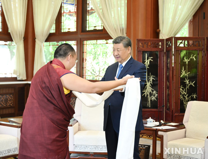 [베이징=신화/뉴시스] 시진핑(오른쪽) 중국 국가 주석이 6일(현지 시간) 베이징 중난하이 지도부 청사에서 제11대 판첸 라마 기알첸 노르부로부터 '하다'(경의나 축복의 의미를 담은 비단 천)를 받고 있다. 기알첸 노르부는 이날 시 주석을 예방했다. 2025.06.07.