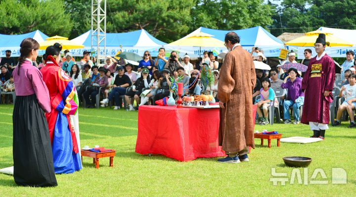 [증평=뉴시스] 서주영 기자 = 7일 충북 증평군 증평민속체험박물관에 열린 '2025 증평들노래축제'에서 전통 혼례가 재현되고 있다. 2025.06.07. [email protected]
