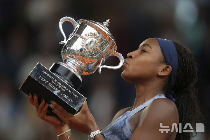 [파리=AP/뉴시스] 코코 고프(2위·미국)가 7일(현지 시간) 프랑스 파리 롤랑가로스 스타디움에서 열린 프랑스오픈 여자 단식 정상에 올라 트로피를 들고 입 맞추고 있다. 고프는 결승에서 아리나 사발렌카(1위·벨라루스)에게 2-1(6-7 6-2 6-4) 역전승을 거두고 생애 처음으로 프랑스 오픈 우승컵을 들어 올렸다. 2025.06.08.