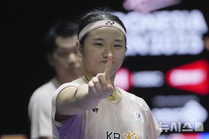 [자카르타=AP/뉴시스] 안세영(1위)이 8일(현지시간) 인도네시아 자카르타 이스토라 스타디움에서 열린 세계배드민턴연맹(BWF) 월드투어 슈퍼 1000 인도네시아 오픈 여자 단식 결승에서 왕즈이(2위·중국)를 꺾은 후 세리머니하고 있다. 안세영이 2-1(13-21 21-19 21-15)로 역전승을 거두고 4년 만에 정상을 탈환했다. 2025.06.08.