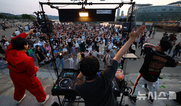 [서울=뉴시스] 황준선 기자 = 8일 오후 서울 서초구 반포한강공원 수변무대에서 열린 한강 무소음 DJ 파티를 찾은 시민들이 무선 헤드폰을 착용하고 춤을 추고 있다. 2025.06.08. [email protected]