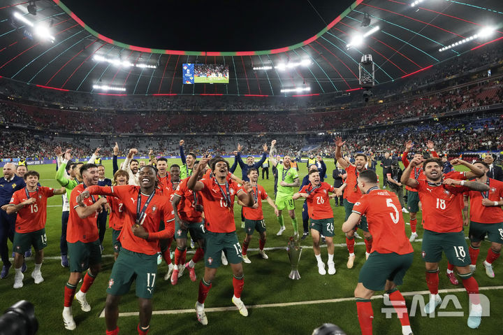 [뮌헨=AP/뉴시스] 포르투갈 선수들이 8일(현지 시간) 독일 뮌헨의 알리안츠 아레나에서 열린 2024-25 유럽축구연맹(UEFA) 네이션스리그(UNL) 스페인과의 결승전에서 승리해 우승한 후 트로피를 들고 환호하고 있다. 포르투갈은 연장까지 2-2 무승부를 기록해 승부차기 끝에 5-3으로 승리해 6년 만에 정상에 올랐다. 크리스티아누 호날두는 후반 16분 동점 골을 넣어 A매치 138호 골을 기록했다. 2025.06.09.