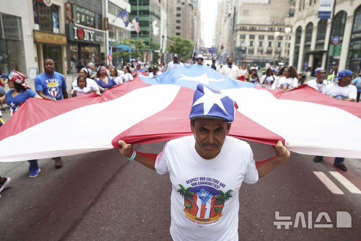 [뉴욕=AP/뉴시스] 8일(현지 시간) 미국 뉴욕에서 열린 제68회 푸에르토리코의 날 퍼레이드에서 참가자들이 대형 푸에르토리코 깃발을 들고 5번가를 따라 행진하고 있다. '푸에르토리코의 날' 행사는 매년 6월 두 번째 일요일에 맨해튼 5번가를 중심으로 열린다. 2025.06.09.