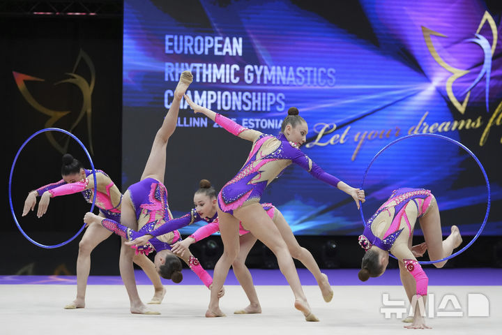 [탈린=AP/뉴시스] 8일(현지 시간) 에스토니아 탈린의 유니베트 아레나에서 열린 제41회 유럽 리듬체조 선수권대회 종목별 결승에서 튀르키예 대표팀이 후프 연기를 펼치고 있다. 2025.06.09.