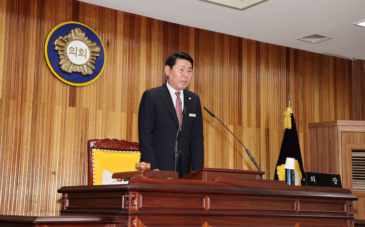 [영동=뉴시스] 충북 영동군의회 신현광 의장이 9일 334회 군의회 1차 정례회에서 개회사를 낭독하고 있다. 의회는 26일까지 18일간 행정사무감사, 결산승인, 예비비 지출 승인, 일반안건·조례안 심사 등을 진행한다. (사진=영동군의회 제공) 20-25.06.09. [email protected]