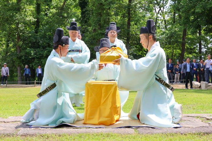 [서울=뉴시스] 전성수(오른쪽) 서초구청장이 8일 서울 서초구 내곡동 헌릉에서 열린 조선 제3대 태종대왕 603주기 기신제에서 제향을 봉행하고 있다. (사진=서초구 제공) 2025.06.09. [email protected] *재판매 및 DB 금지