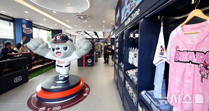 [서울=뉴시스] 추상철 기자 = 9일 오전 서울 송파구 잠실야구장 인근에 오픈한 CU 신천올림픽점 두산베어스 팝업스토어에 CU와 두산베어스 협업 제품 및 굿즈가 진열돼 있다. 2025.06.09. [email protected]