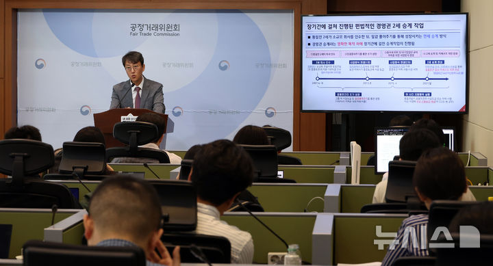 [세종=뉴시스] 강종민 기자 = 최장관 공정거래위원회 기업집단감시국장이 9일 세종시 정부세종청사에서 중흥건설이 2세 소유의 중흥토건과 중흥토건의 6개 계열회사가 시행하고 중흥토건이 단독 시공하는 주택건설 및 일반산업단지 개발사업에서 각 시행사의 PF·유동화 대출에 무상 신용보강을 제공하는 행위에 대해 시정명령과 과징금을 부과하고, 중흥건설을 고발한다고 밝히고 있다. 2025.06.09. [email protected]