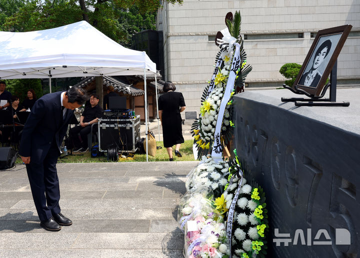 [서울=뉴시스] 박주성 기자 = 9일 서울 서대문구 연세대학교 이한열동산에서 열린 제38주기 이한열 추모식에서 우상호 대통령실 정무수석이 참석해 영정에 인사를 하고 있다. 2025.06.09. [email protected]
