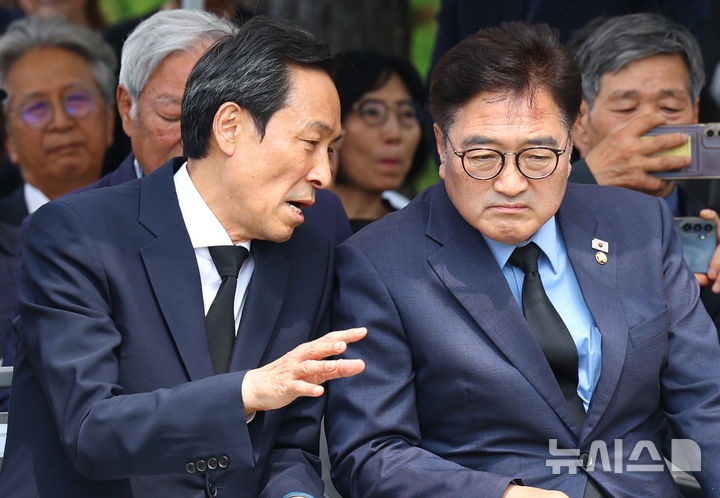 [서울=뉴시스] 박주성 기자 = 9일 서울 서대문구 연세대학교 이한열동산에서 열린 제38주기 이한열 추모식에서 우상호 대통령실 정무수석(왼쪽)과 우원식 국회의장이 참석해 이야기를 나누고 있다. 2025.06.09. [email protected]