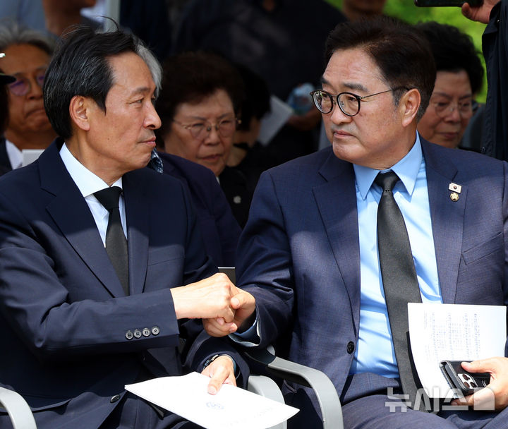 [서울=뉴시스] 박주성 기자 = 9일 서울 서대문구 연세대학교 이한열동산에서 열린 제38주기 이한열 추모식에서 우상호 대통령실 정무수석(왼쪽)과 우원식 국회의장이 참석해 인사를 나누고 있다. 2025.06.09. [email protected]