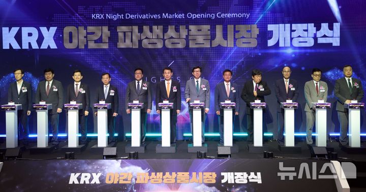 [부산=뉴시스] 하경민 기자 = 한국거래소(KRX) 야간 파생상품시장 개장식이 열린 9일 부산 롯데호텔에서 참석자들이 개장 신호식을 갖고 있다. 왼쪽부터 정정훈 한국자산관리공사 사장, 윤창현 코스콤 사장, 빈대인 BNK금융그룹 회장, 서유석 금융투자협회장, 김병환 금융위원장, 정은보 한국거래소 이사장, 박형준 부산시장, 이헌승 국회의원, 박진현 KBS부산총국장, 이순호 한국예탁결제원 사장, 김세완 자본시장연구원장, 유병태 주택도시보증공사 사장.