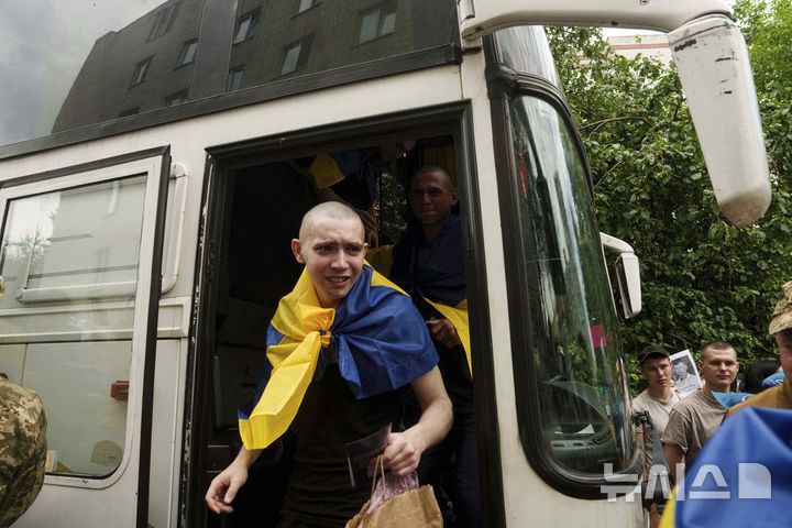 [체르느히우=AP/뉴시스] 9일(현지 시간) 우크라이나 체르느히우에서 러시아와의 포로 교환으로 석방된 한 우크라이나 군인이 버스에서 내리며 감격에 겨운 듯 눈물을 흘리고 있다. 러시아와 우크라이나가 25세 미만과 중상자 포로를 교환했다. 2025.06.10.