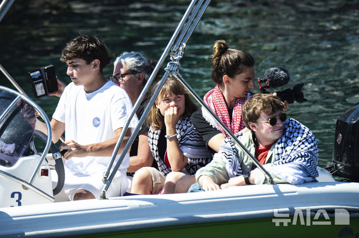 [카타니아(이탈리아)=AP/뉴시스]스웨덴의 기후운동가 그레타 툰베리(가운데)가 지난 1일 이탈리아 시칠리아의 카타니아항에서 가자지구로 출항하는마들린호에 탑승하기 위해 다른 활동가들과 기다리고 있다. 이스라엘 외무부는 10일 하루 전 체포된 툰베리 등 활동가 4명을 추방했다고 밝혔다. 2025.06.10.