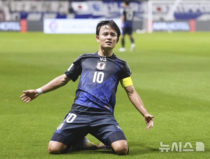 [스이타=AP/뉴시스] 일본의 쿠보 다케후사가 10일(현지 시간) 일본 서부 스이타 경기장에서 열린 2026 국제축구연맹(FIFA) 북중미 월드컵 아시아 3차 예선 C조 10차전 인도네시아와의 경기 전반 19분 추가 골을 넣고 세리머니하고 있다. 후반전이 진행 중인 가운데 일본이 4-0으로 앞서고 있다. 2025.06.10.