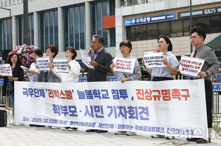 [서울=뉴시스] 김근수 기자 = 행동하는 학부모네트워크와 전국여성연대 회원들이 10일 서울 용산구 대통령실 앞에서 리박스쿨 늘봄학교 침투, 진상규명 촉구 학부모 및 시민 기자회견에서 리박스쿨 규탄 손 피켓을 들고 서 있다. 2025.06.10. [email protected]
