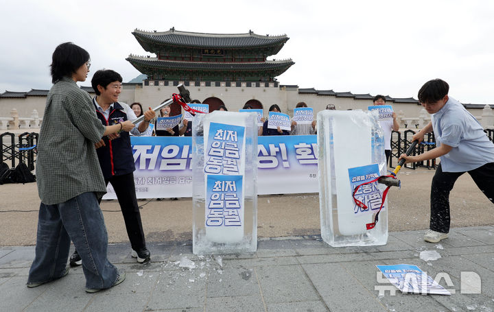 [서울=뉴시스] 홍효식 기자 = 민주노총과 시민사회 청년 학생들이 10일 오전 서울 종로구 광화문 월대 앞에서 열린 청년학생노동자 최저임금 요구 기자회견에서 최저임금 동결과 차별을 부수기 위한 대형 얼음 격파 퍼포먼스를 하고 있다. 2025.06.10. [email protected]