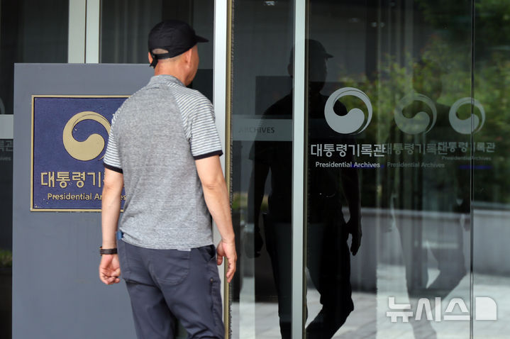[세종=뉴시스] 강종민 기자 = '채상병 사망 사건 수사 외압 의혹'을 수사하는 고위공직자범죄수사처가 세종시 어진동 대통령기록관에 대한 압수수색을 벌인 10일 대통령기록관으로 한 시민이 출입하고 있다. 2025.06.10. [email protected]